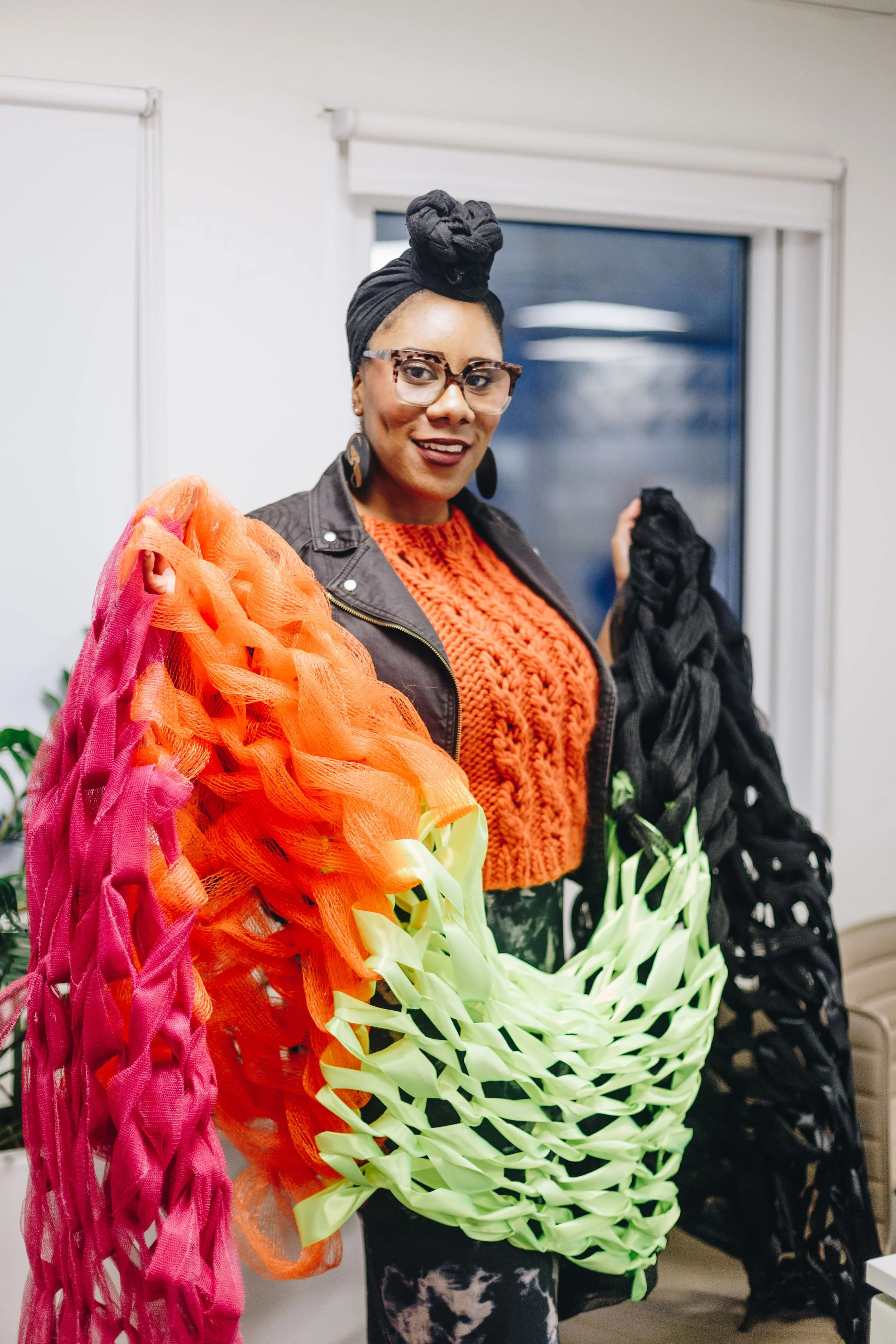 The large-scale arm knits incorporate upcycled industrial scaffolding netting sourced from constriction businesses, ribbon, tulle, rope textures and other repurposed textiles some sourced locally from East London based textile reuse hubs such as the Childrens Scrap Project and Yodomo, a Hackney Wick based business that identifies waste materials that can be reused by the maker community.